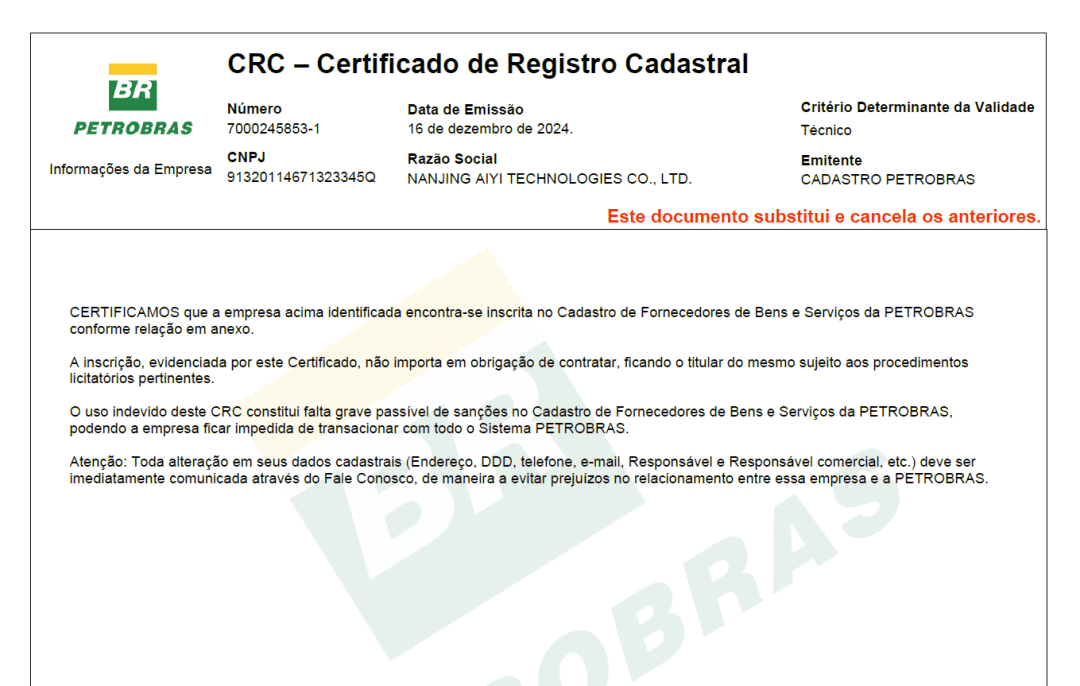 经过不懈努力和技术升级,终于成功斩获TUV巴西认证,这是契合巴西国家石油公司(Petrobras)强制要求的认证标准!并已成功获得了在巴西国家石油公司的注册证书,实现历史性突破!