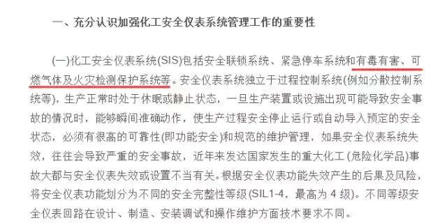 自2014年以后,gds系统属于sis系统中的一部分,其依据是2014年的原安监总局《国家安全监管总局关于加强化工安全仪表系统管理的指导意见》(安监总管三 [2014] 116号)(以下简称116号文),文中规定“化工安全仪表系统(SIS)包括安全联锁系统、紧急停车系统和有毒有害、可燃气体及火灾检测保护系统等”。