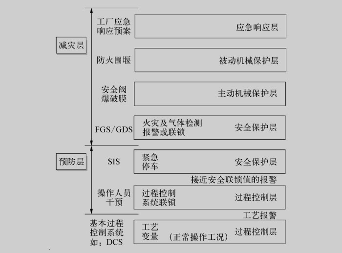 根据IEC定义的独立保护层(IPL)模型,工艺装置通过自动化控制系统降低风险主要分为三个层面,即基本过程控制系统层(basic process control system layer)、预防层 (prevention layer)和减灾层(mitigation layer)。